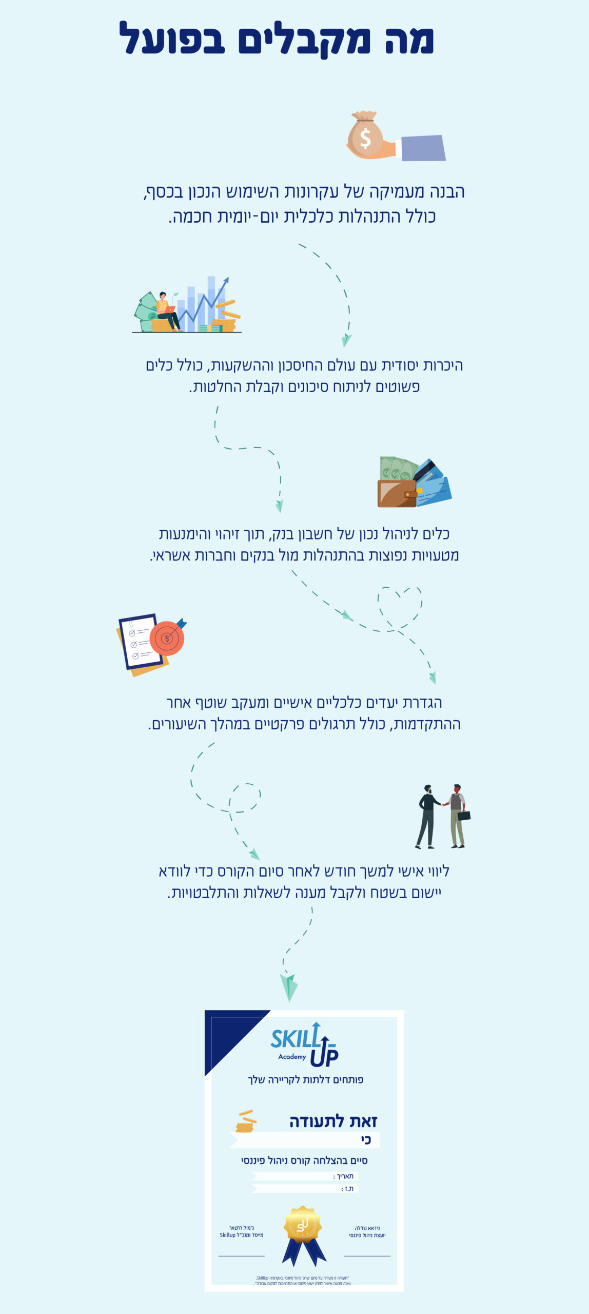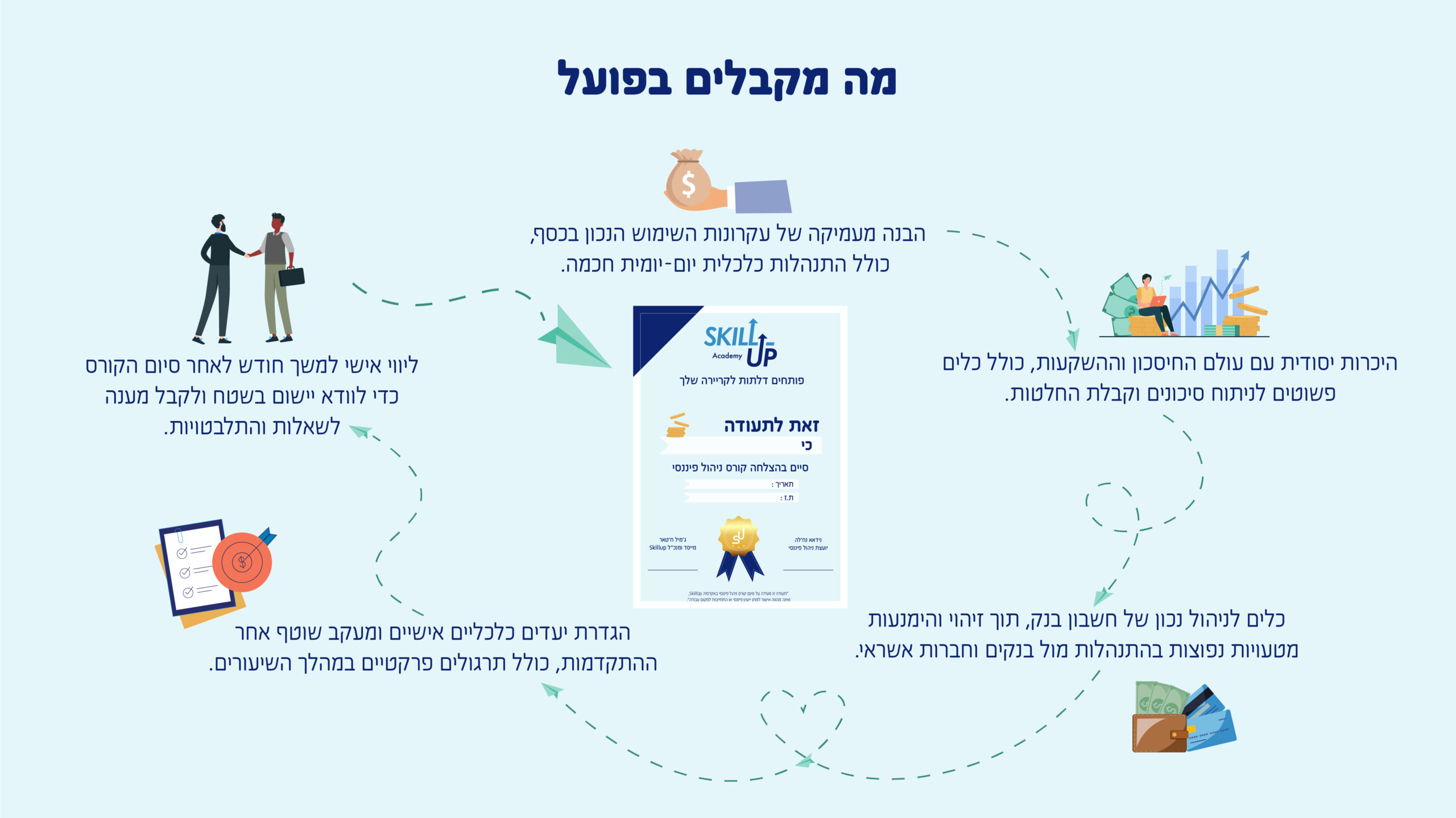מה נלמד בקורס שיעור 1 שיעור 2 שיעור 3 שיעור 4 שיעור 5 מה נלמד בקורס שיעור 1 שיעור 2 שיעור 3 שיעור 4 שיעור 5 שאלות נפוצות – (FAQ) האם צריך רקע מוקדם ? לא, הקורס מתאים לכל אדם, ללא צורך בידע מוקדם בתחום הפיננסי. האם יש תעודה בסיום הקורס ? כן, כל משתתף יקבל תעודת סיום מטעם אקדמיית SkillUp. עם זאת, חשוב לציין שהתעודה אינה מהווה הסכמה פורמלית ואינה מקנה יתרון ישיר בקבלה לעבודה. אפשר לשלם בתשלומים ? בהחלט, ניתן לשלם בתשלומים נוחים – בהתאם לצורכי הלקוח. איך הקורס מתבצע ? ואיפה הקורס מתקיים בכיתה סגורה, באווירה מקצועית וממוקדת. מיקום, כפר מסעדה. איך נרשמים לקורס ? ניתן לפנות אלינו דרך מספר הטלפון בוצ׳אפ או להשאיר פרטים באתר או לפנות אלינו בעמוד האינסטגרם. מעוניינים לעשות שינוי בהתנהלות עם כסף ? השאירו פרטים ובוא תשמעו מה יש לנו להציע! להורדת סילבוס הקורס השאירו פרטים ובוא תשמעו מה יש לנו להציע! Please enable JavaScript in your browser to complete this form.Please enable JavaScript in your browser to complete this form.שם מלא * טלפון מייל שם טלפון *מיילשלח Whatsapp Instagram