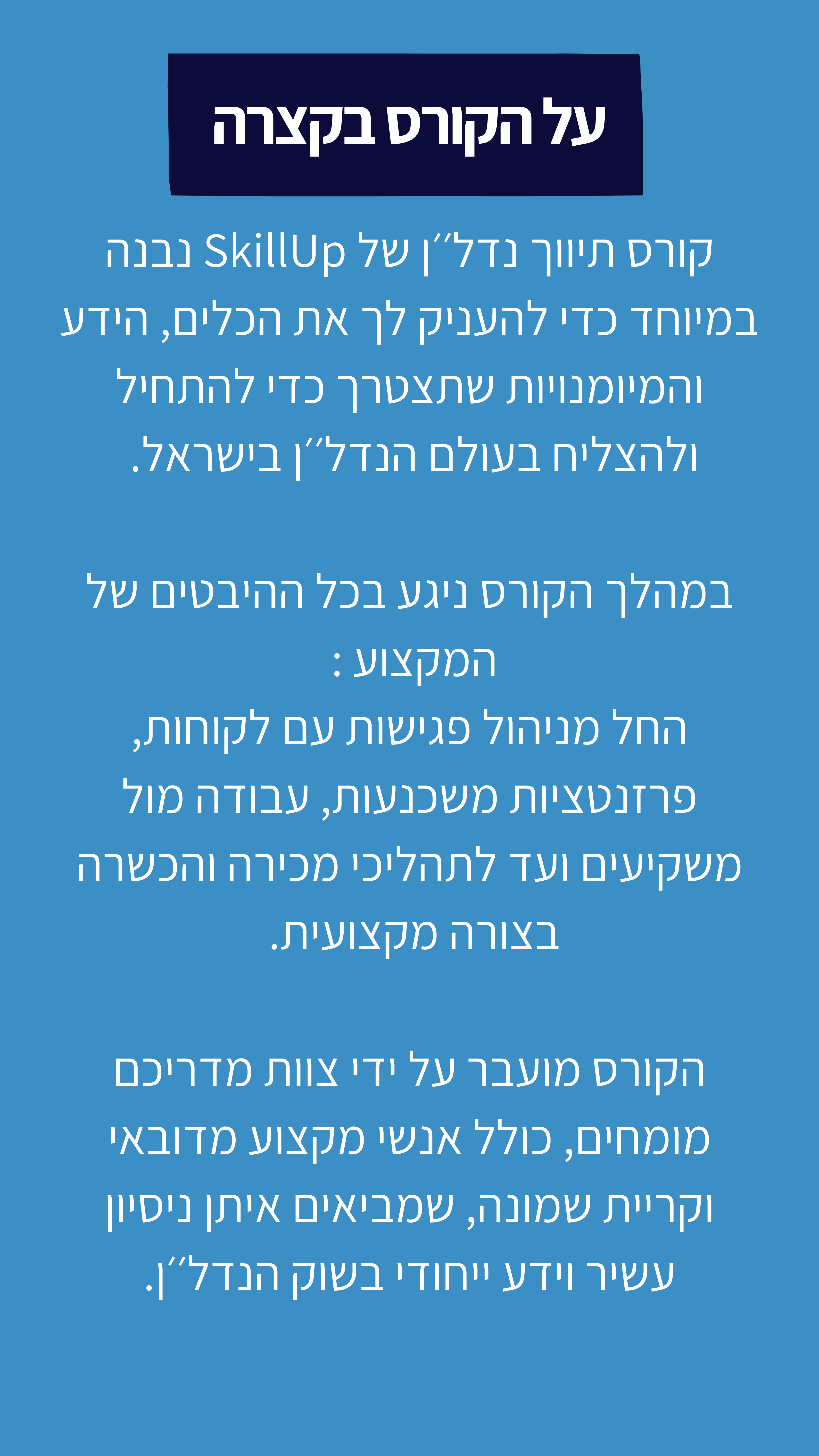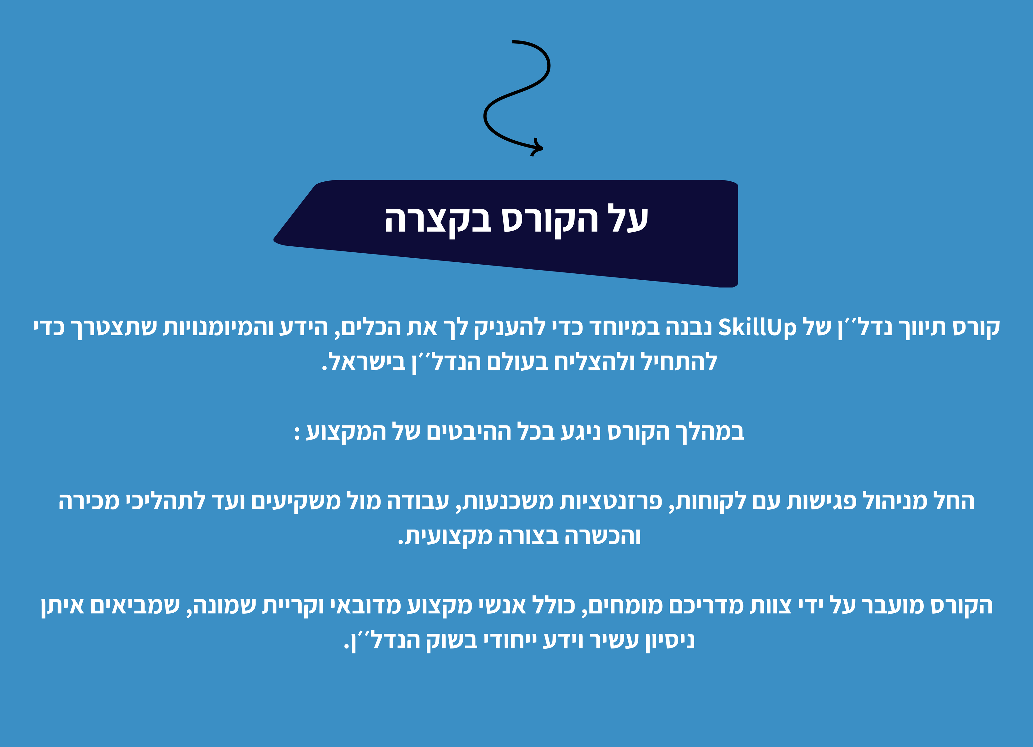 למי מתאים הקורס ? כל אדם שמעוניין לכנס לעולם הנדל״ן ולעבוד כעצמאי בתחוםאנשים שרוצים לרכוש ידע בתחום הנדל״ןהקורס מתאים לכל הגילאים מה תקבל בקורס ? המומחים שלנו - מדריכים אורחים בקורס המומחים שלנו - מדריכים אורחים בקורס דעתם של הסטודנטים שלנו - סיפורי הצלחה ! בואו נדבר ! תשאירו פרטים ונדאג לחזור אליכם Instagram Whatsapp Please enable JavaScript in your browser to complete this form.Please enable JavaScript in your browser to complete this form.שם מלא *טלפון * מייל טלפון שם מייל *שלח